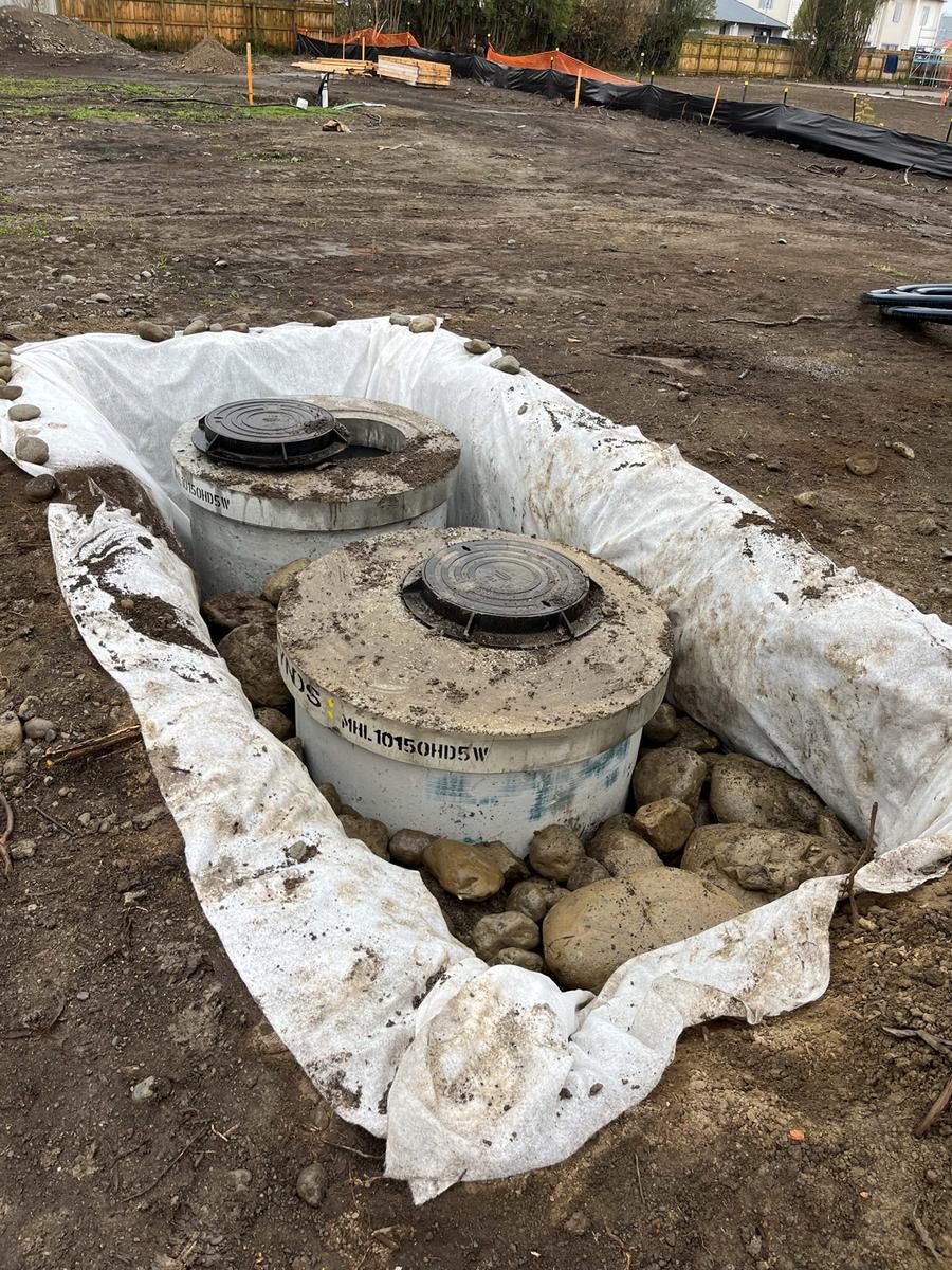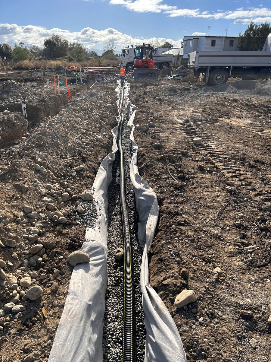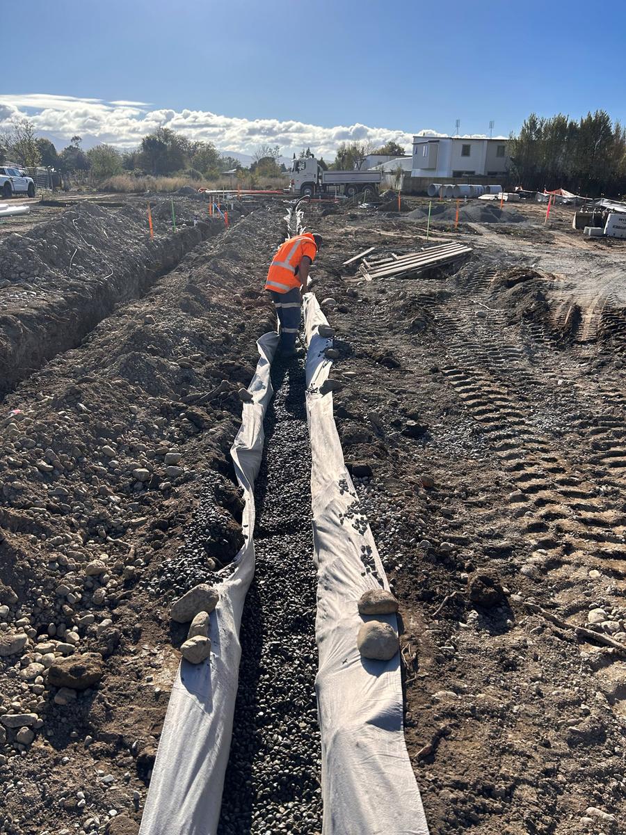Managing all civil works in-house gave Kāinga Ora greater confidence over programme, quality, and safety outcomes across four residential subdivisions in Masterton. This 34-lot development involved the installation of water, wastewater, and stormwater networks, including 300mm SN16 stormwater mains, 1050mm RCRRJ class 4 culverts, 1800mm stormwater chambers, and large RainSmart soakage systems. Roads, kerbing, and footpaths were also constructed as part of the full subdivision package. One of the key challenges was coordinating multiple trades operating simultaneously across separate sites. Careful planning and staged sequencing were required to keep momentum and avoid delays. Weather conditions and sediment control obligations added further complexity, all of which were managed through proactive site leadership. All three waters and civil infrastructure works were self-performed, with subcontractors used only for house pad preparation. This reduced risk for the client and gave more certainty across key delivery milestones. Regular engagement with Kāinga Ora and TW Construction, including scheduled meetings and clear site communication protocols, supported timely decisions and a safe working environment throughout.